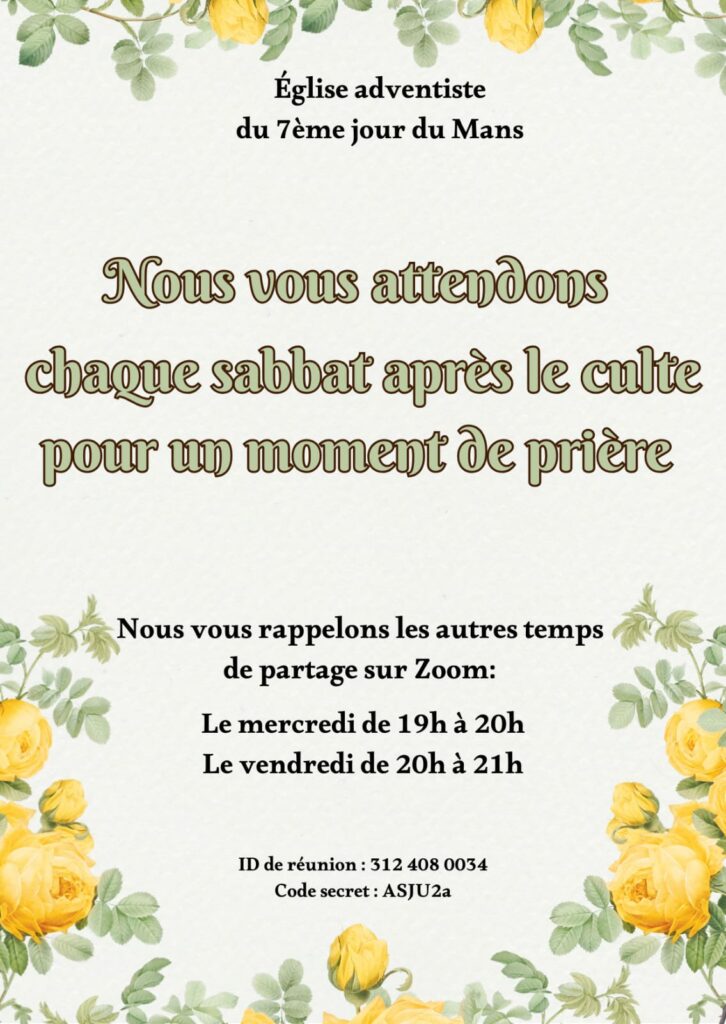 Réunion de prière : Ven 20h00 - 21H00 (zoom)